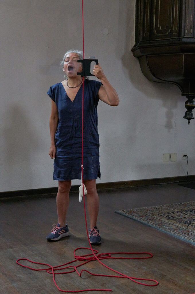 (ø 8mm), Gewichte, Griffkonstruktion (Holz, Polycarbonat) mit aufgedampftem, nicht kondensierendem Schriftzug dem Atem entfliehst du nicht, anlässlich der Biennale 2025 Ortung14 – im Zeichen des Goldes in Schwabach Deutschland, zu sehen in der “Franzosenkirche“ in Schwabach.