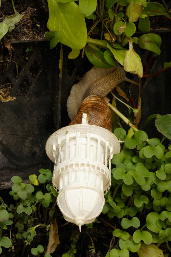 L №4, 2009, 120 x 120 x 120 cm, Kubus aus Gemüseharassen, Weinbergschnecken, Papiermodelle nach historischen Zentralbauten, Futterpflanzen, Georg Kolbe Museum Berlin (Deutschland).