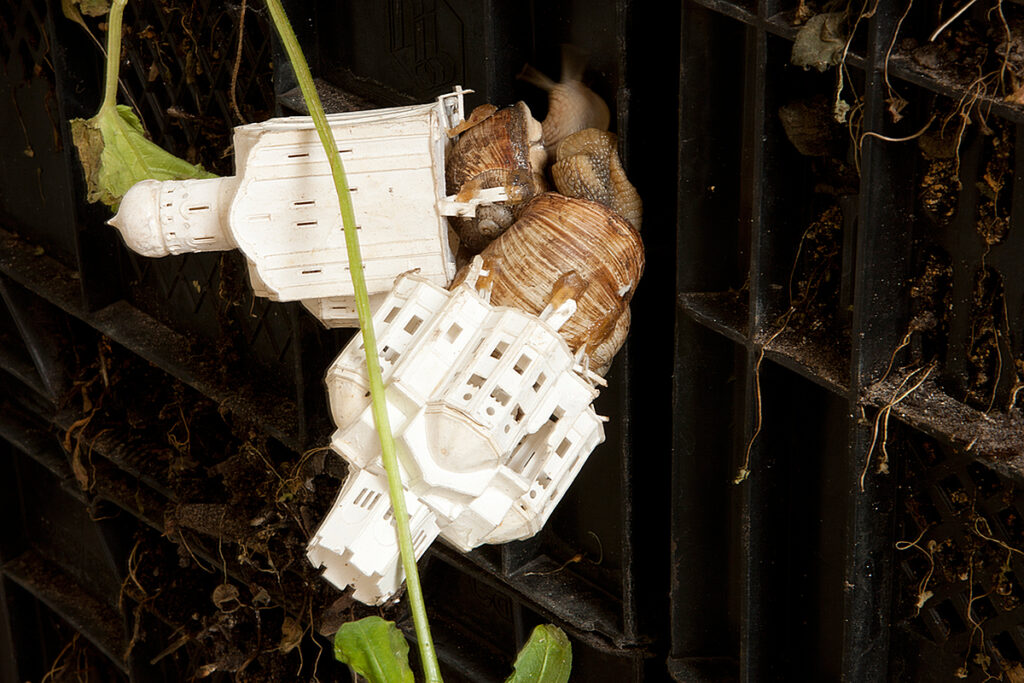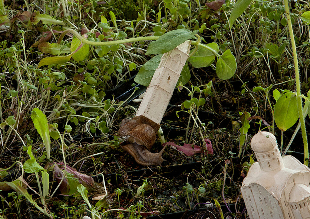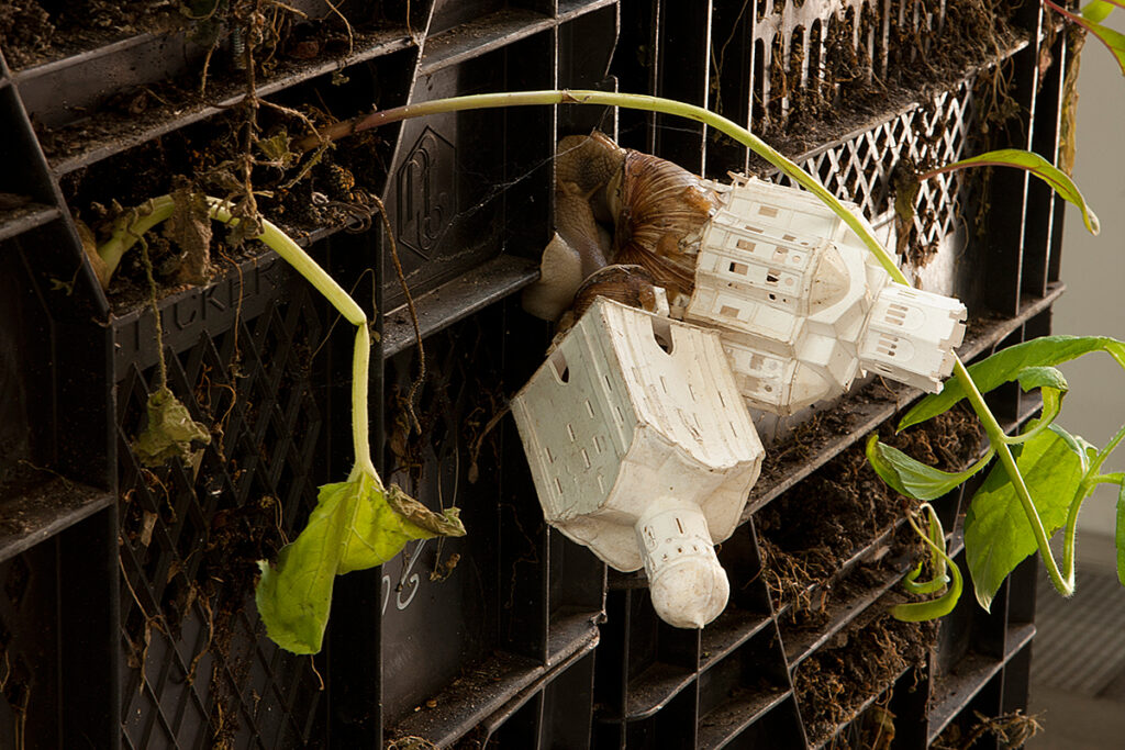 Foto: Anselmo FoxL №4, 2009, 120 x 120 x 120 cm, Kubus aus Gemüseharassen, Weinbergschnecken, Papiermodelle nach historischen Zentralbauten, Futterpflanzen, Georg Kolbe Museum Berlin (Deutschland).