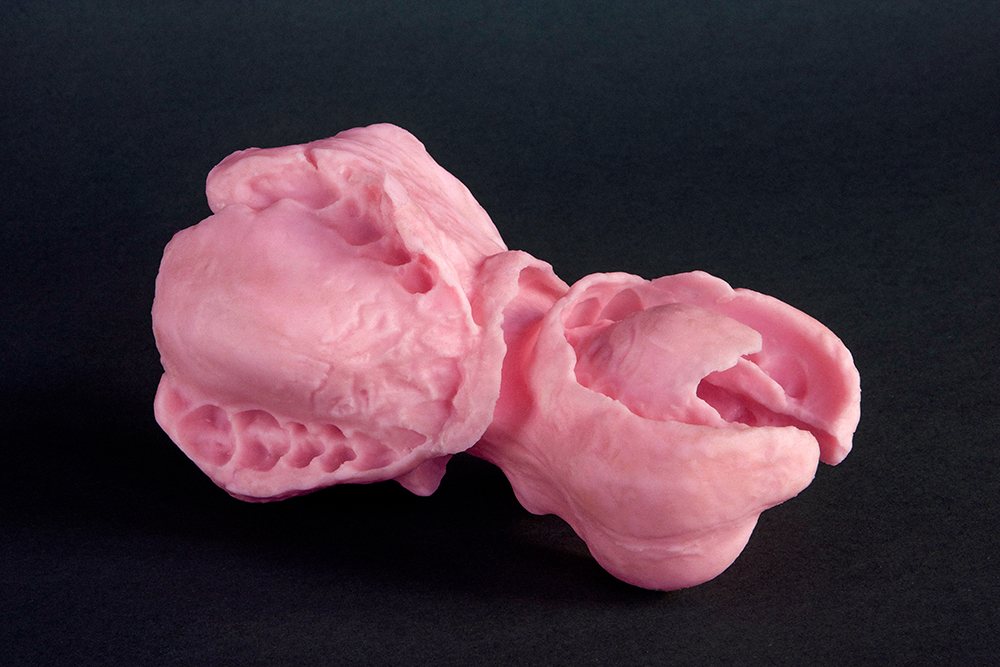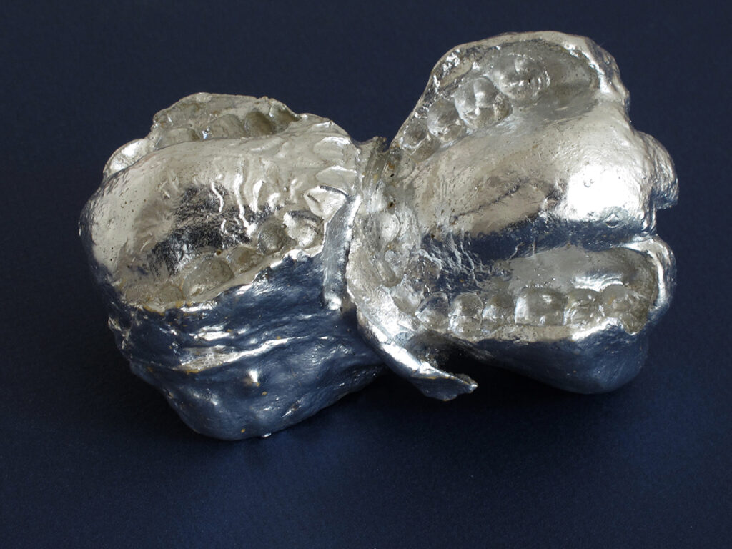 As a rule, when you see the kiss, you do not feel it; if you feel it, you do not see it. [...] clearly two-parted, even two-leaved, but irregular, somehow alienating, bay-like, hunched shape in front of eyes, very precisely provided with funniest pores, folds, Palate fluting, toothprints, lip wrinkles. The head and body of the kisser are absent; physically present is the negative of both mouths. Never was a kiss closer and more distant at the same time. Invalid, alien, inexpressive, cold, even repugnant and yet in a curious way, exciting, mesmerizing: one weighs the inside of the mouth of two people in the hand, turns it back and forth, looks through the cavity of the tongue, through the hole into another tongue into it - and remembers the "adversary" that Lessing talks about when mouths open. Here we are in the mouth. Hartmut Böhme in Erkundungen der Mundhöhle – Zur Kunst von Anselmo Fox, S. 20, Neue Ästhetik. München 2002